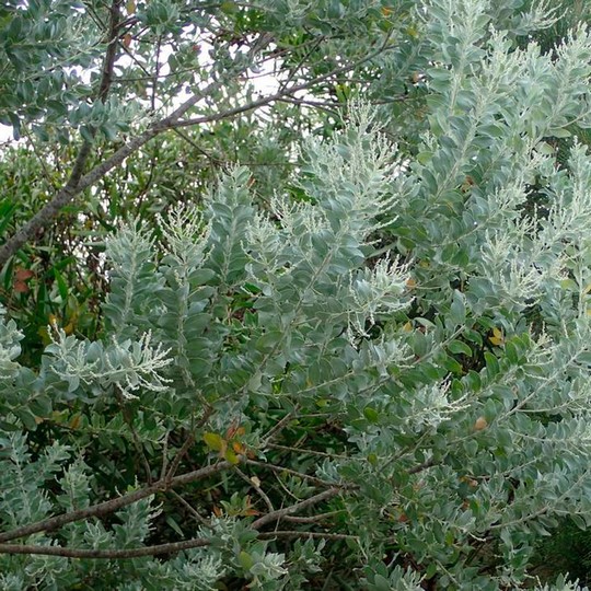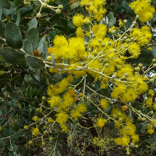 Árbol de follaje perene, de rápido crecimiento y alcanza una altura de 5m de alto. Posee una copa globosa, follaje de color verde grisáceo. Florece a principios de primera en racimos de color amarillo. Tolera vientos salinos pero necesita exposición al sol directo.
