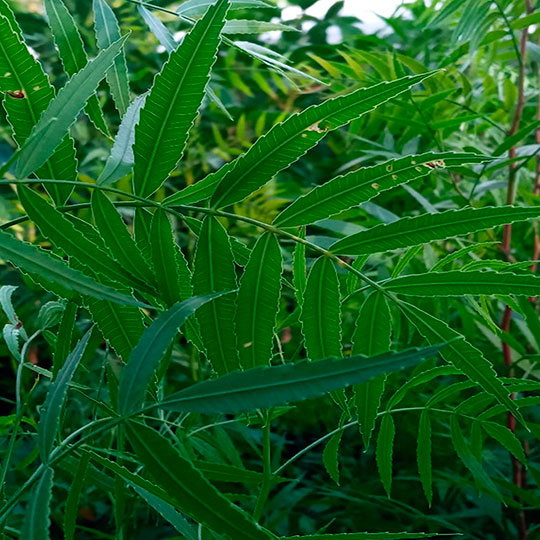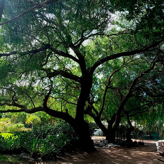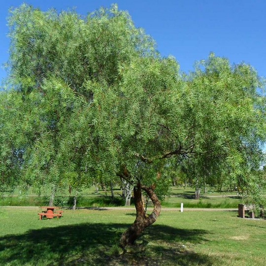 Árbol de porte medio, de copa redondeada, fuste ramificado a baja altura. Copa globosa. Follaje verde claro, frondoso, péndulo, persistente. Sus frutos son unas drupas globosas, de color marrón rojizo que se descascara rápidamente.