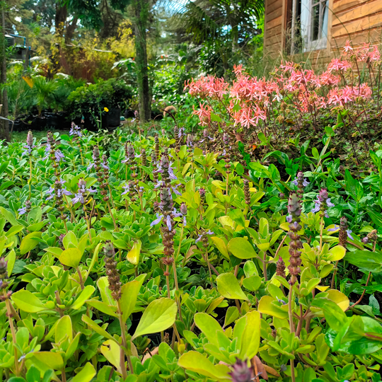 Planta tapizante que, además, produce una floración delicada de color violáceo.Le gusta el pleno sol y soporta la semisombra. Posee hojas ovadas, altamente fragantes