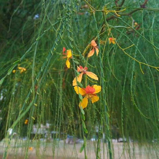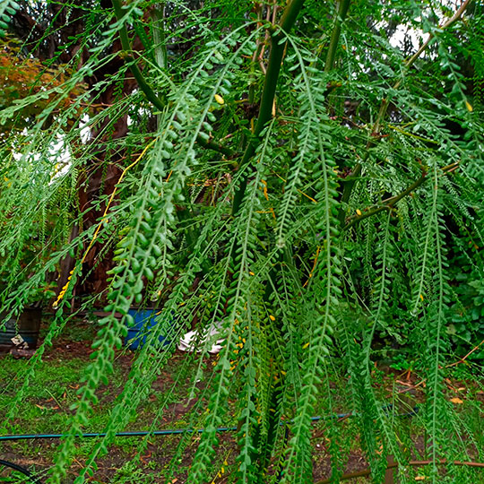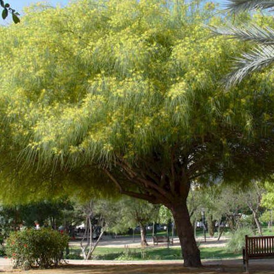 Árbol de porte medio, aparasolado, de tamaño achaparrado, fuste corto y un poco retorcido, ramificado a poca altura. Las ramas presentan espinas y son de color verde cuando son jóvenes. Su follaje es caduco. Presenta unas flores color amarillo, a fines de primavera y principios de verano. Sus frutos son unas legumbres largas y delgadas.