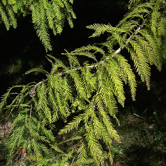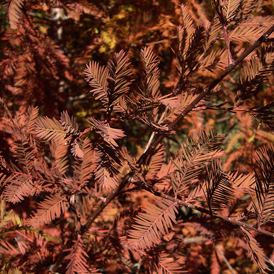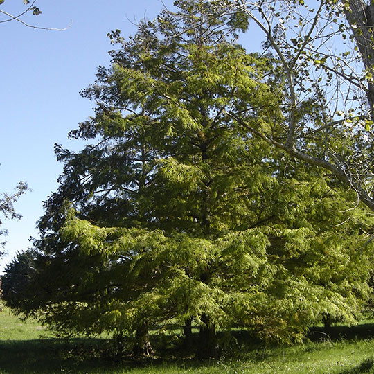 El Ciprés calvo o Ciprés de los pantanos, es un árbol de copa amplia piramidal, follaje de color verde claro, que se adapta muy bien a lugares húmedos. Es una especie de follaje caduco que adquiere una tonalidad rojiza muy llamativa en otoño. Resulta ideal para forestar zonas temporalmente inundadas, donde las raíces, con frecuencia, afloran del terreno