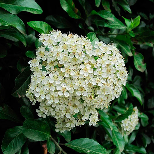 En primavera se tupe de flores blancas y sus frutos naranjas a rojizos aparecen en otoño. Es muy utilizado como generador de cerco.