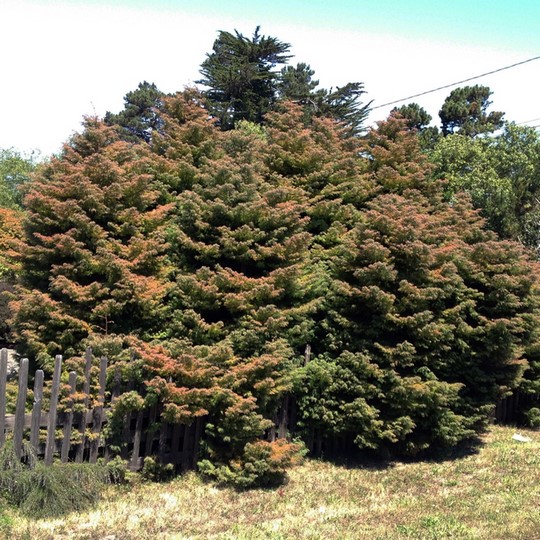 Árbol de follaje perenne, de crecimiento lento alcanzado 10m de alto. Posee una copa columna, con un follaje sutil. El color de su follaje es verde oscuro pero en los meses de frio se torna naranja-rojizo.