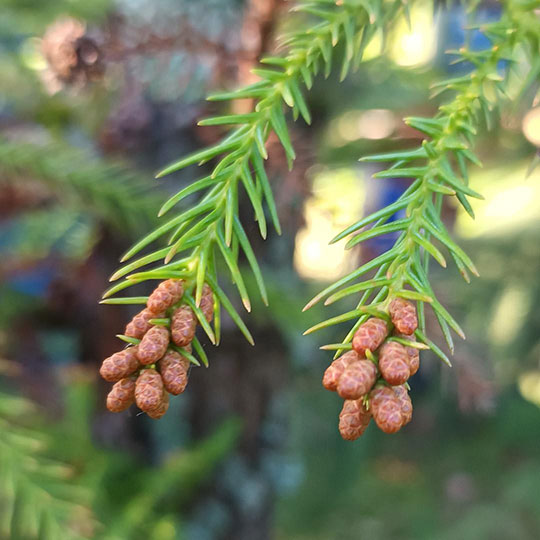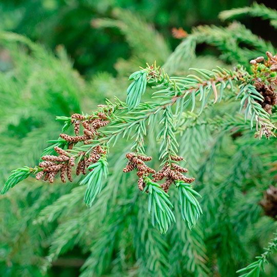 Árbol de follaje perenne, de crecimiento lento alcanzando 30m de alto. Al principio posee una copa piramidal y simétrica, se vuelve luego globosa e irregular. Se destaca el color marrón que toman sus hojas en el otoño para después recobrar el verdor en primavera.