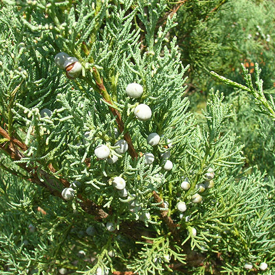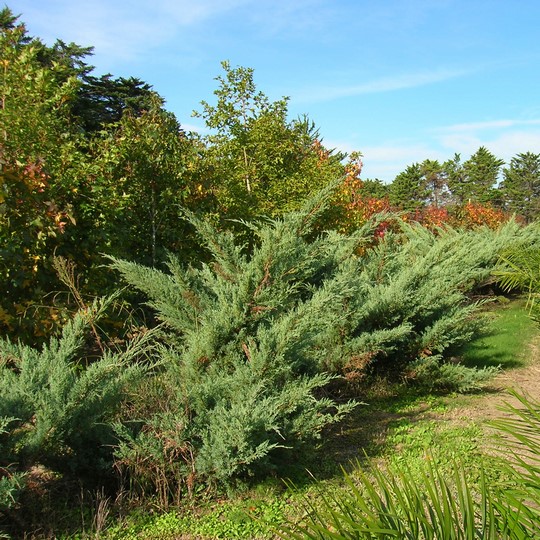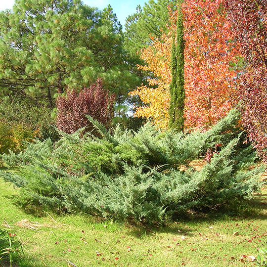 Arbusto de follaje perenne rastrero, crecimiento medio pudiendo llegar a 3m de diámetro y 1m de alto. Posee un porte rastrero, su follaje es color verde grisáceo, es muy utilizada en los jardines por su rusticidad y resistencia a vientos salinos. Se utilizan para generar cerco o cubrir pendientes, no posee flores atractivas. Se puede plantar en ejemplares aislados o para formar grupos. Origen: América del Norte