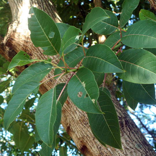 Árbol de gran porte, muy corpulento, aunque de baja altura alcanza los 10 a 15 metros de altura, con una copa amplia, globosa. Su base se ensancha, desde donde a veces surgen rebrotes vigorosos. Follaje caduco o semipersistente. Las ramillas jovenes muchas veces son de color violáceo. Las flores son color verde amarillento, y se agrupan en inflorescencias péndulas. Es de crecimiento rápido y ocupa grandes áreas por lo que generalmente se ultizan en jardines amplios y parques.