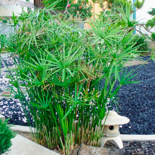 El cyperus alternifolius es una planta perenne, de entre 50-150 cm de altura. Posee un rizoma bastante corto y horizontal. Los tallos, de 4-7 mm de diámetro, son triangulares, lisos a finamente escabrosos. Cada tallo está coronado por una umbela de brácteas (10-25) en forma de hojas oblongo-lanceoladas de textura coriácea dispuestas en radio, como las varillas de un paraguas abierto. La inflorescencia es una espiguilla que porta una pequeña flor de color verde pálido.