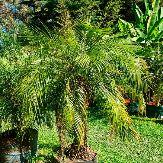 Es una palmera enana, con una altura máxima de 5 metros, pero generalmente su tronco no mide más de 1 metro. Es de crecimiento lento. Posee flores diminutas amarillentas, florece en verano y su fruto es una drupa globosa comestible de color oscuro cuando está maduro. Es muy ornamental para colocar en jardines o en el interior.