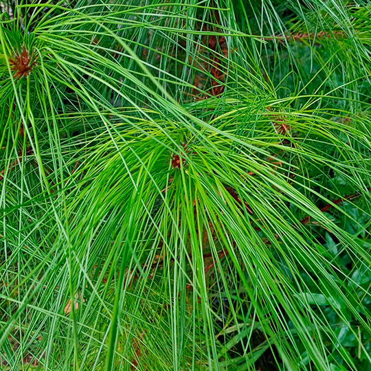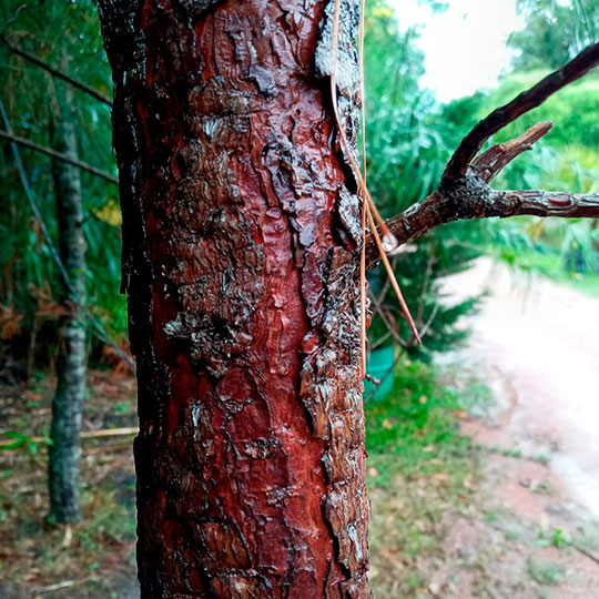 Árbol de fuste (tronco) recto, donde las ramas inferiores se desprenden naturalmente. Su corteza es escamosa, color castaño rojiza. Sus hojas estan agrupadas en fascículos de 2 o 3 acículas, de 15 a 30 cm de largo, de color verde brillante. Es de rápido crecimiento.
