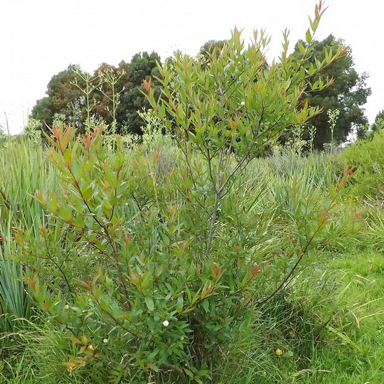 Es un arbusto bajo, de cerca de 2 m de altura, extendido, glabro (inerme) e hidrófilo. Follaje caducifolio verdoso oscuro. Las hoja son simples, ternadas, lanceoladas a ovadles, glabras. Tiene flores pequeñas, en cabezuelas, blancuzcas, presenta numerosos estambres. El fruto es seco, indehiscente, de cerca de 5 mm de largo, pardo oscuro. Origen: América del Sur