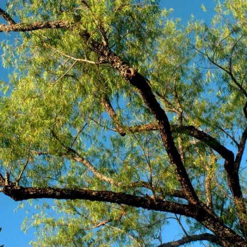 Árbol de gran corpulencia y diámetro, de copa globosa. Presenta una corteza gris, con lenticelas. Sus hojas son bipinnadas, de color verde intenso que caen en otoño. El fruto es una legumbre encorvada, que cuando madura es de color negro, leñosa. En invierno se presenta sin hojas, mostrando la belleza de su corteza, y sus frutos negros colgando.