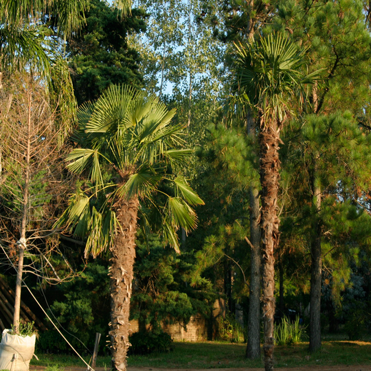 Palmera originaria del Este y centro de China, alcanza hasta 10 metros de altura, donde el tronco queda recubierto por las vainas de las hojas caídas, lo cual le da al observador un aspecto de corteza peluda. Esta característica tan llamativa y rustica es la que la hace extremadamente interesante como palmera ornamental. Sus hojas presentan forma de abanico. Sus frutos son de color negro. Resiste muy bien al frio y a las altas temperaturas. Es una palma excelente para alineaciones.